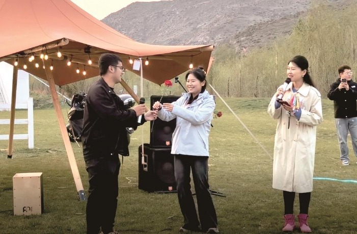 活动现场,一男士主动向心仪的女士递花表达好感。