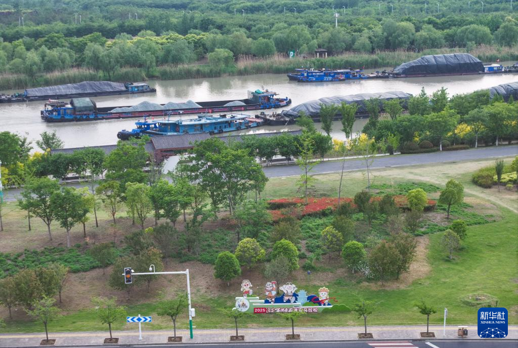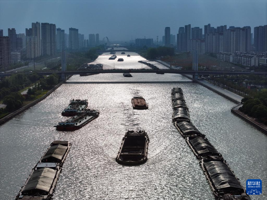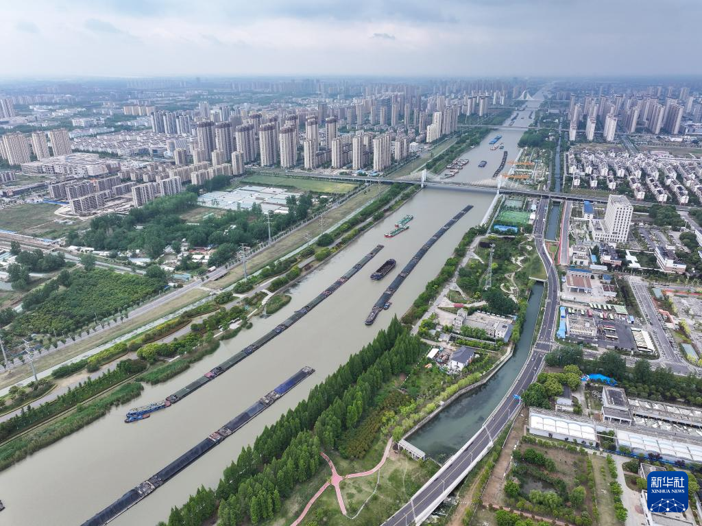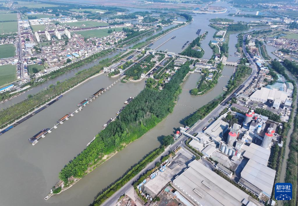船只行驶在京杭大运河淮安段(5月10日摄,无人机照片)。新华社记者 季春鹏 摄
