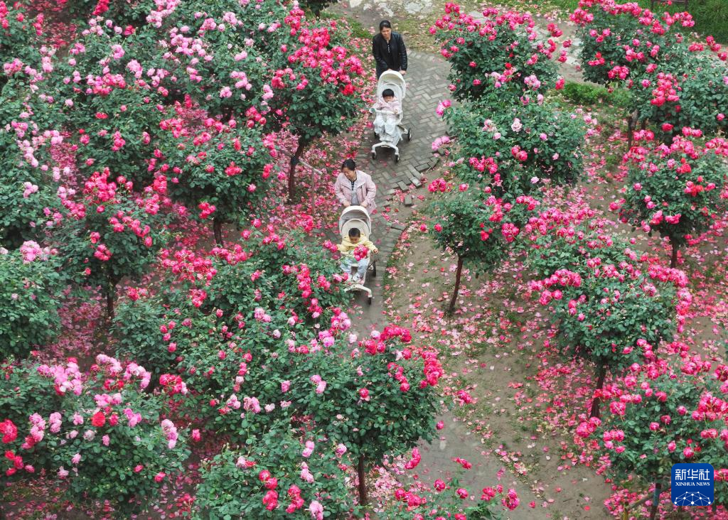市民带着孩子在淮安市楚秀园观赏月季(5月10日摄,无人机照片)。新华社记者 季春鹏 摄