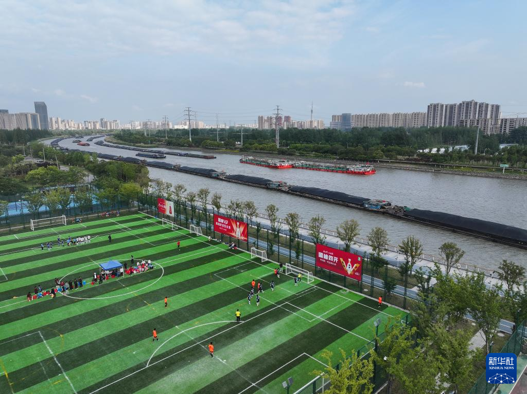 淮安市民在京杭大运河畔进行足球比赛(5月10日摄,无人机照片)。新华社记者 季春鹏 摄
