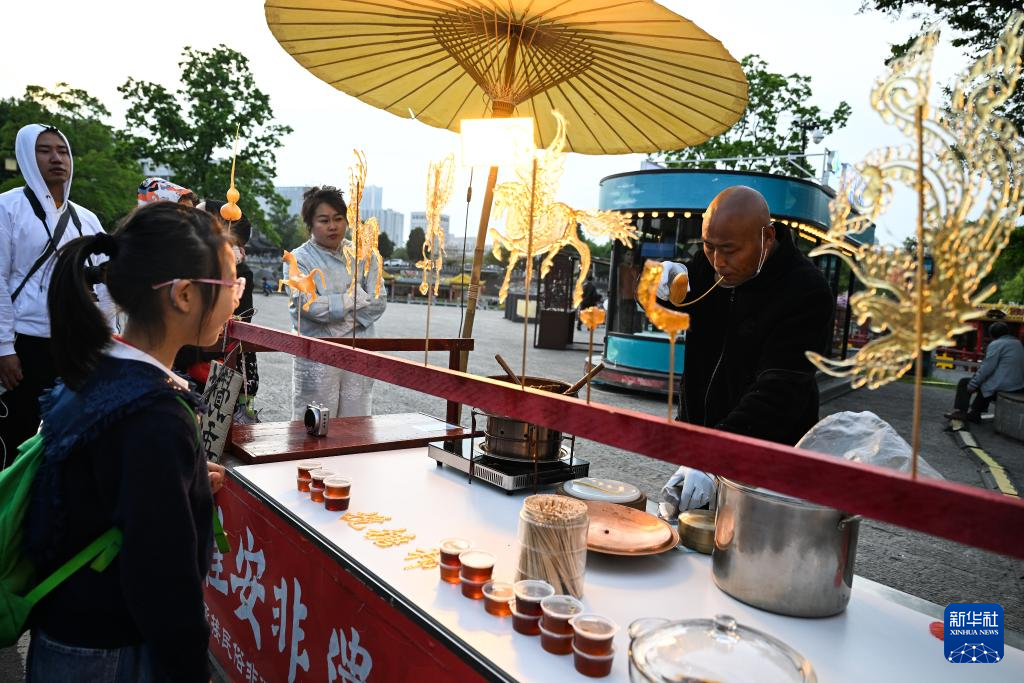 5月10日,游人在淮安里运河文化长廊市集上观看吹糖人。新华社记者 季春鹏 摄