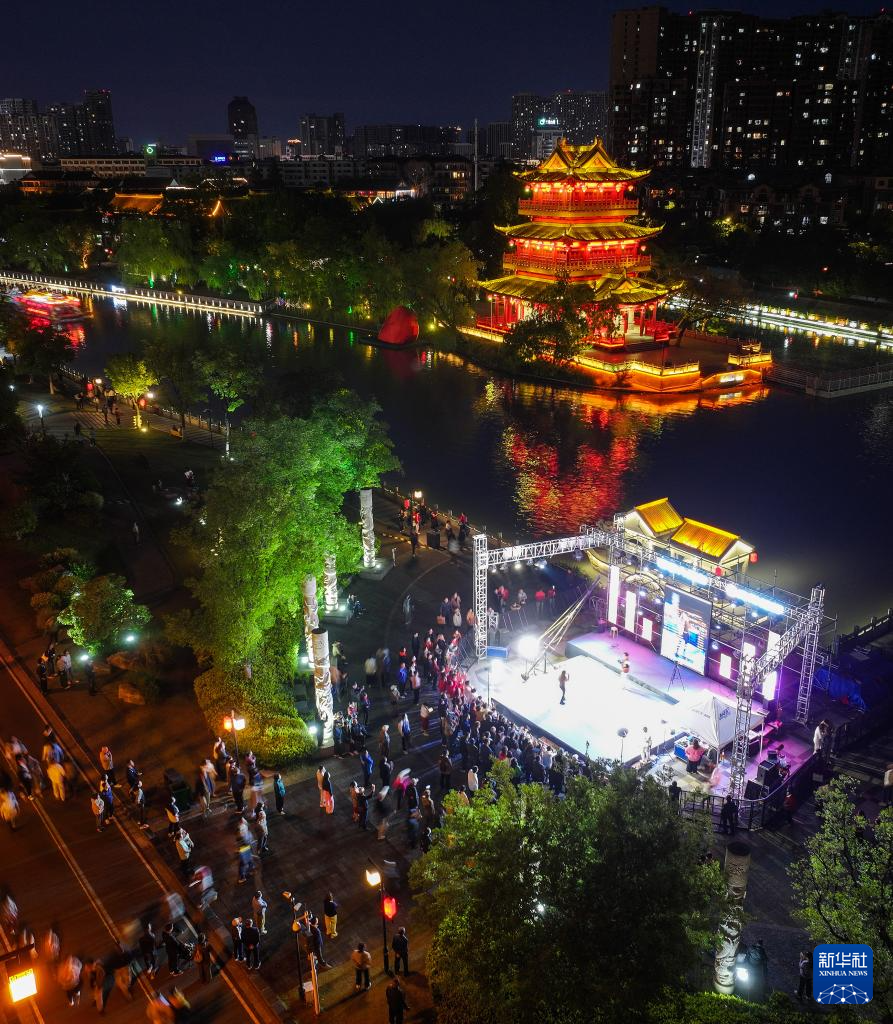 市民和游人在淮安里运河文化长廊观看表演(5月10日摄,无人机照片)。新华社记者 季春鹏 摄