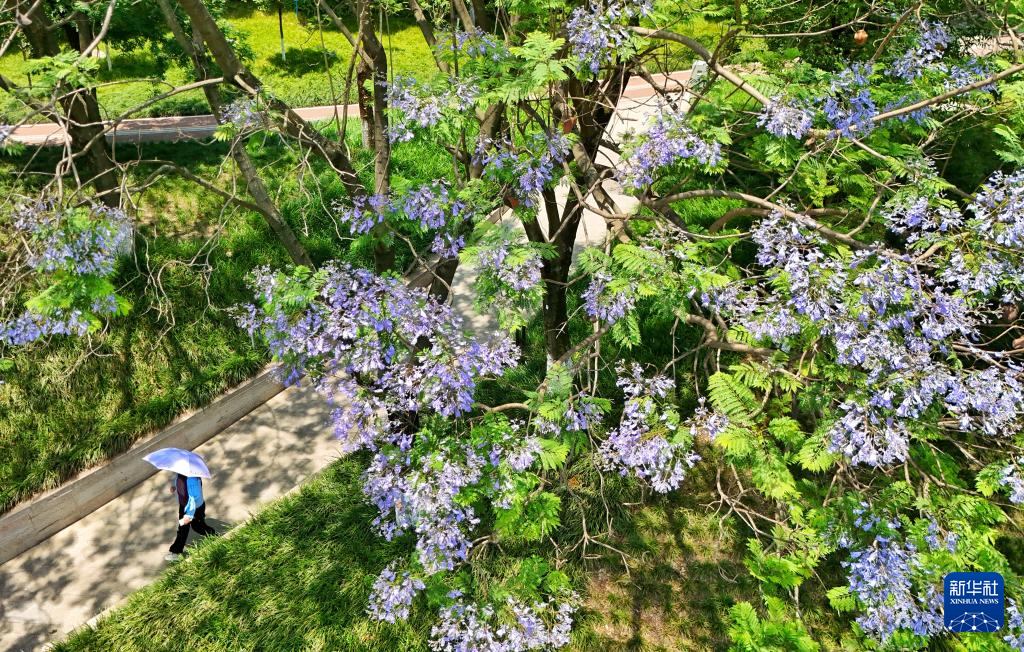 5月12日在成都市武侯区锦江绿道拍摄的蓝花楹(无人机照片)。新华社记者 刘坤 摄