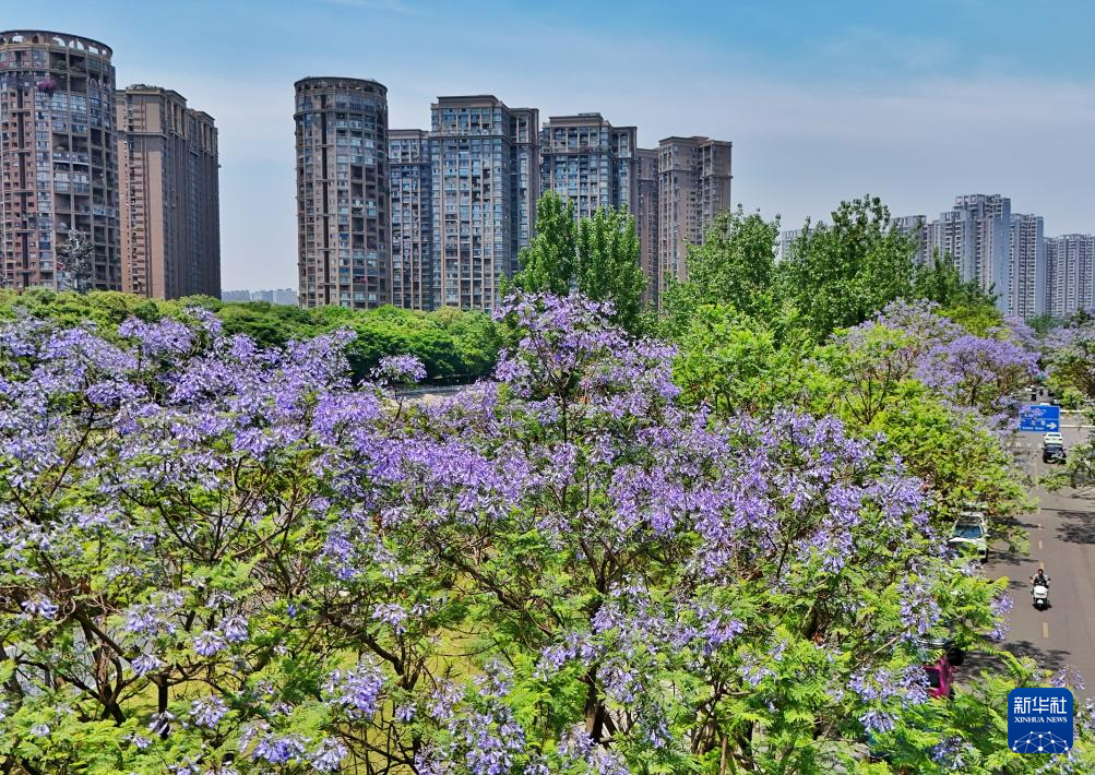 5月12日在成都市锦江区三色路拍摄的蓝花楹(无人机照片)。新华社记者 刘坤 摄