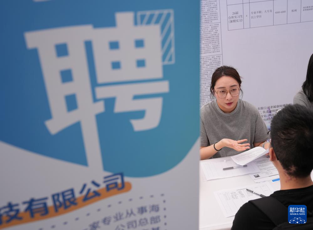 5月13日,一家上市公司的招聘代表(左)在2025杭州市大学生就业·见习招聘会上与前来求职的青年学生交流。新华社记者 韩传号 摄
