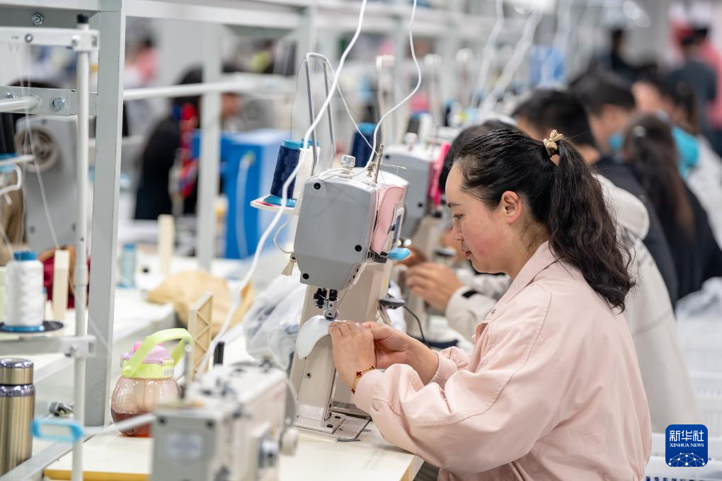 5月13日,云南省昭通市镇雄县居民在镇雄纺织服装产业园制作防晒服。新华社记者 胡超 摄