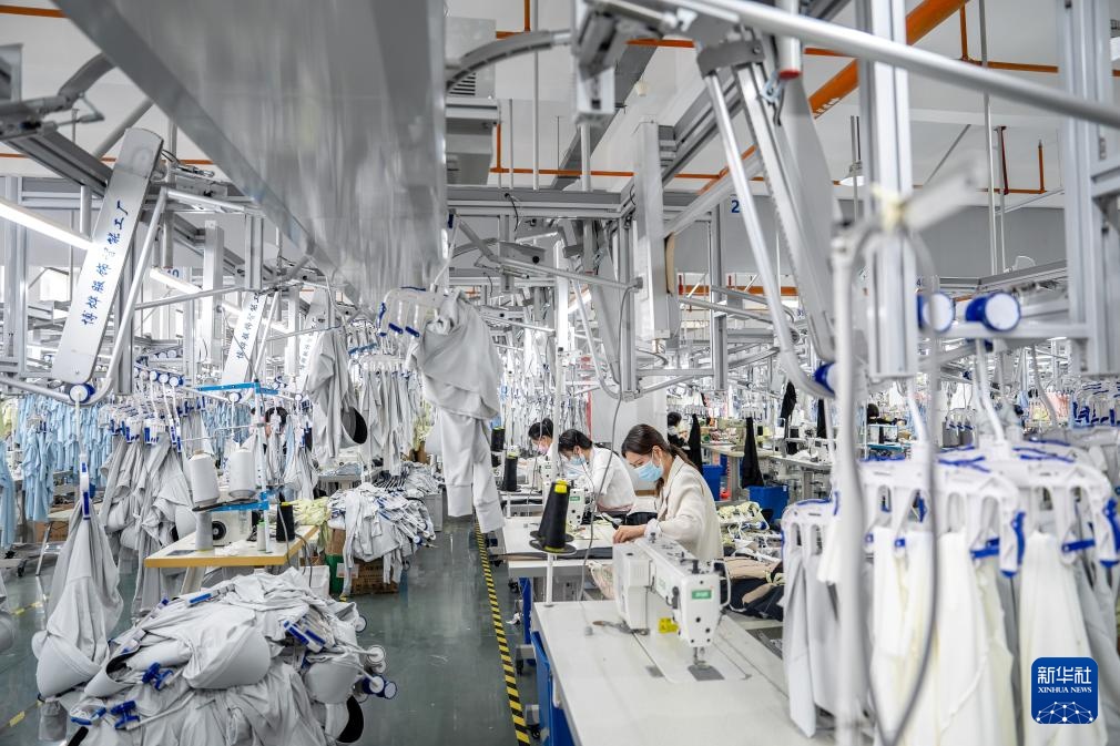 5月13日,云南省昭通市镇雄县居民在镇雄纺织服装产业园制作防晒服。新华社记者 胡超 摄