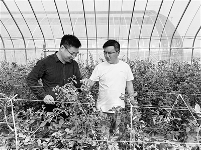 安徽农业大学皖西南综合试验站站长徐支青(左)与种植户交流蓝莓栽培技术。科技日报记者 洪敬谱摄