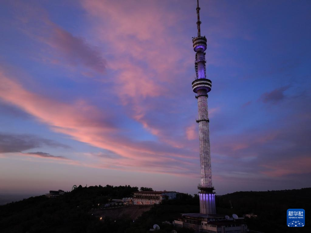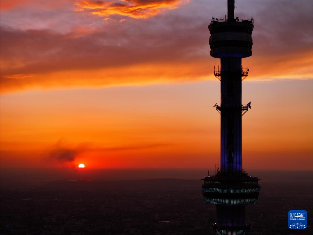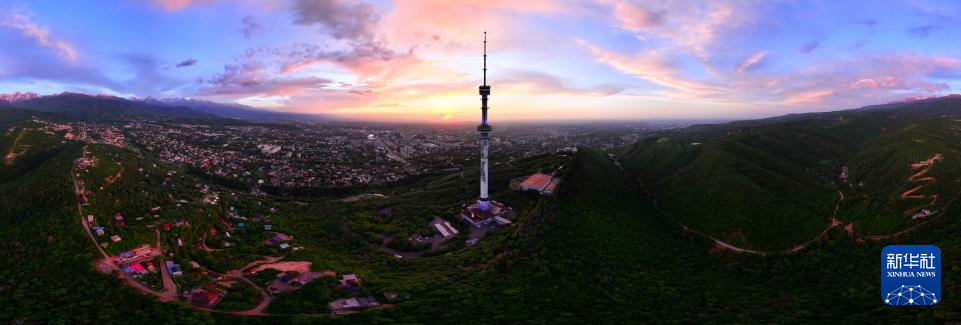 这是5月13日在哈萨克斯坦阿拉木图拍摄的日落时分的科克托别电视塔(无人机照片)。新华社记者 李任滋 摄
