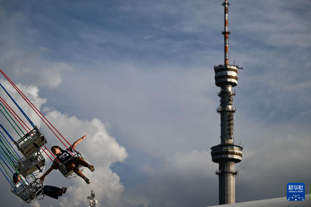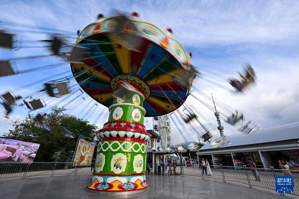 5月13日,人们在哈萨克斯坦阿拉木图的科克托别山体验游乐设施。新华社记者 李任滋 摄