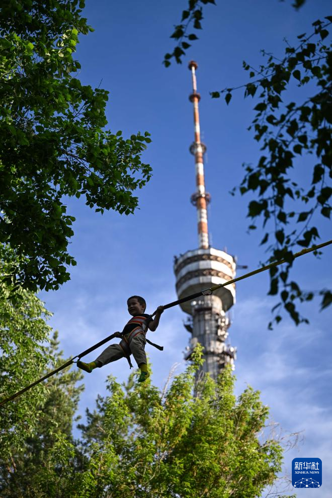 5月13日,一名男孩在哈萨克斯坦阿拉木图的科克托别山体验游乐设施。新华社记者 李任滋 摄