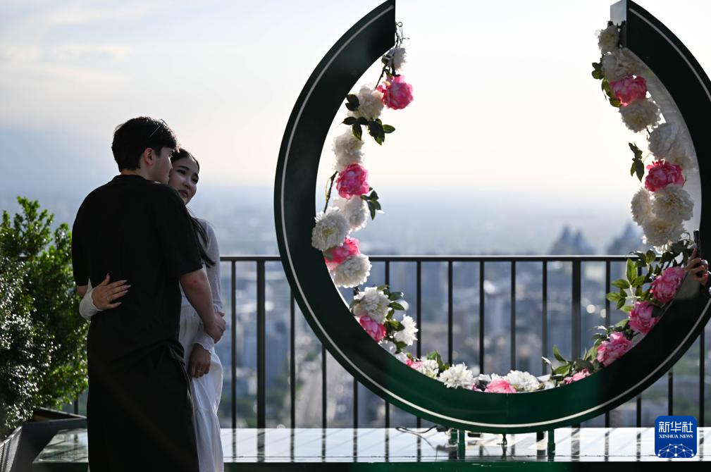 5月13日,一对情侣在哈萨克斯坦阿拉木图的科克托别山拍照留念。新华社记者 李任滋 摄