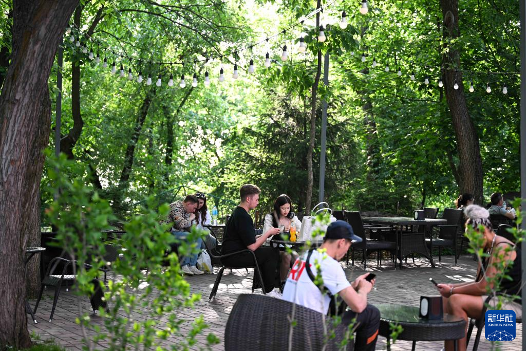 5月13日,人们在哈萨克斯坦阿拉木图的科克托别山休闲。新华社记者 李任滋 摄