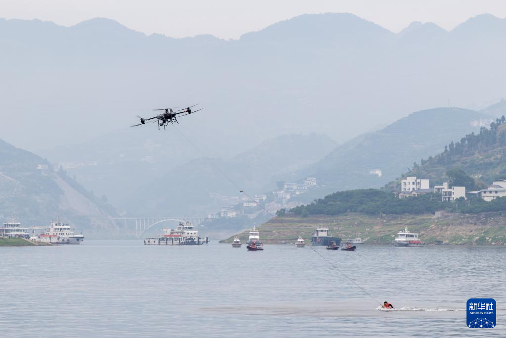 5月15日,在重庆市奉节县开展的三峡库区地方航道危岩地灾应急实战演练现场,救援无人机在营救模拟落水人员。新华社记者 黄伟 摄