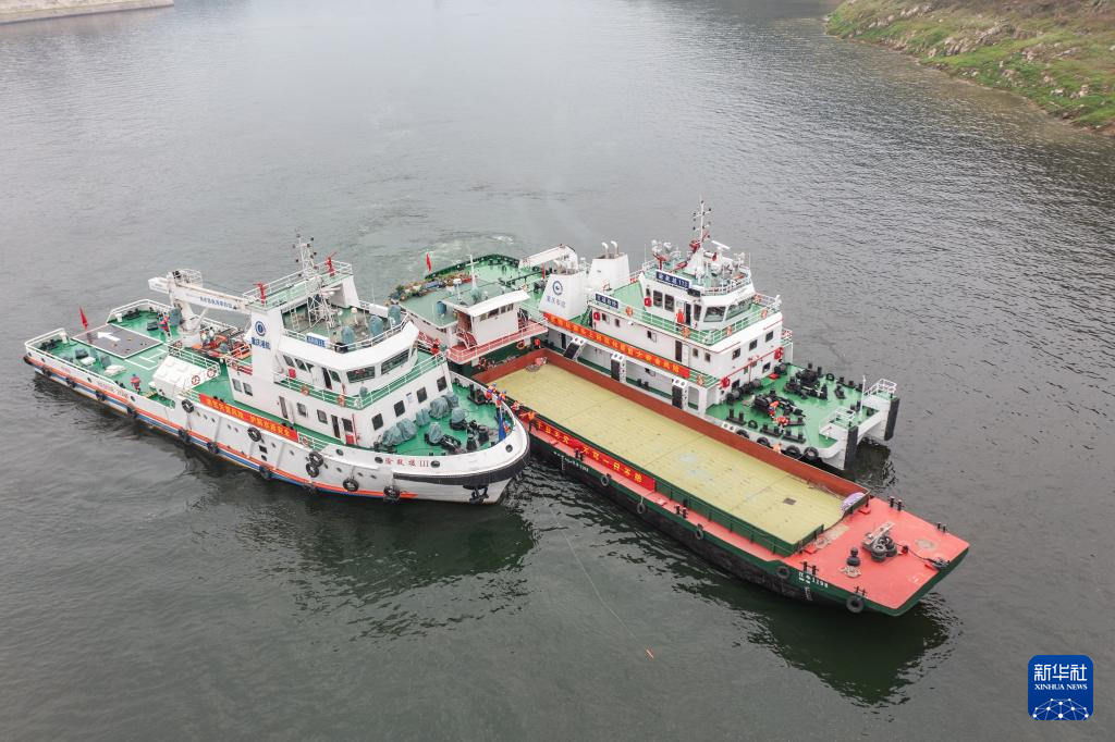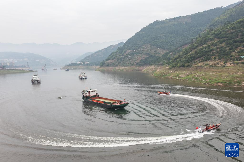 5月15日,在重庆市奉节县开展的三峡库区地方航道危岩地灾应急实战演练现场,拖救船舶在模拟事故水域对断链断缆货轮进行救援(无人机照片)。新华社记者 黄伟 摄