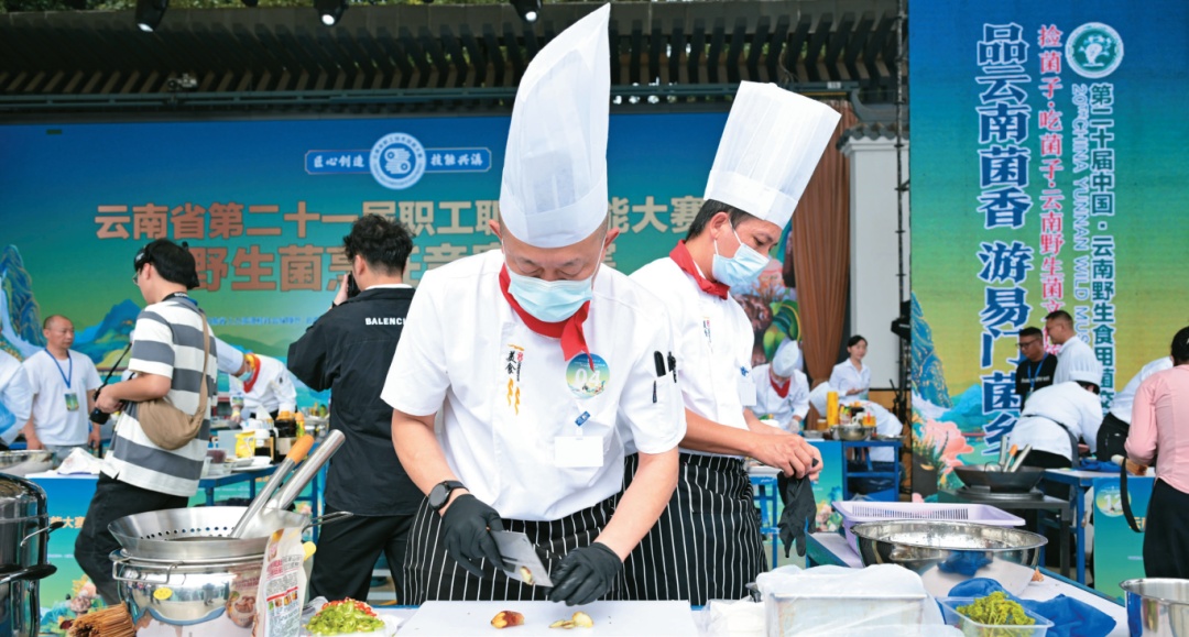 近年来,云南广泛深入持久开展各种形式的劳动和技能竞赛,每年组织不少于100万名职工参赛。2024年,在职工中共产生合理化建议、技术革新、发明创造、先进操作法等13.78万件(项)。图为2024年7月在玉溪市易门县举行的云南省第二十一届职工职业技能大赛野生菌烹饪竞赛决赛现场。云南省总工会供图