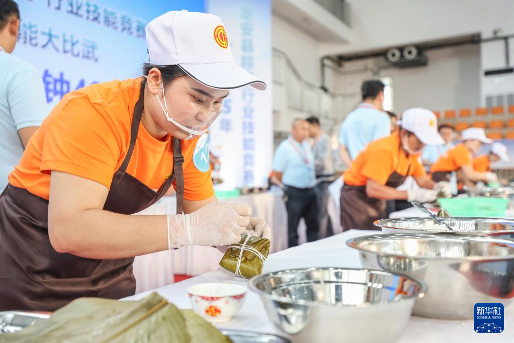 5月16日,参赛选手在海南定安县2025年粽子行业技能竞赛中包粽子。新华社记者 张丽芸 摄