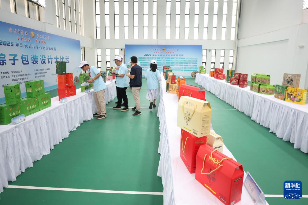 5月16日,评委在海南定安县2025年粽子行业技能竞赛中给粽子包装评分。新华社记者 张丽芸 摄