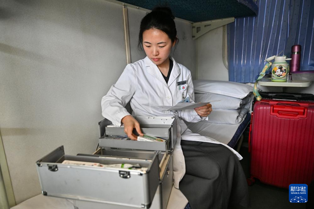 5月16日,“心连心·京藏号”2025年旅游列车上的跟团医生徐欣悦再次核对药品。新华社记者 孙瑞博 摄
