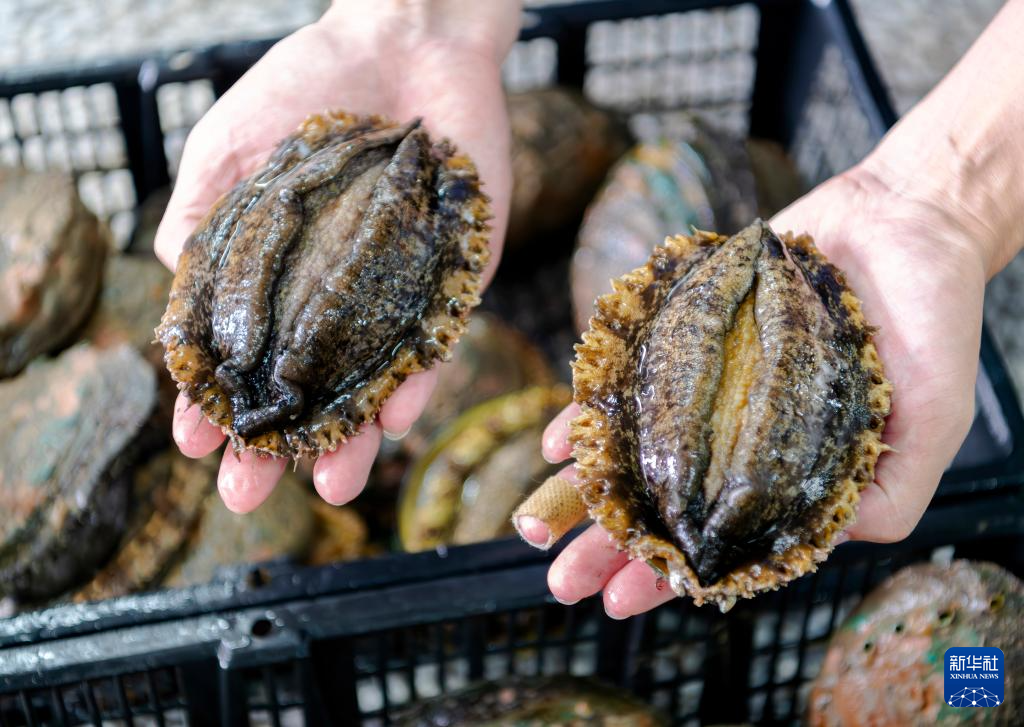 在位于莆田市涵江区的福建省新膳海洋食品有限公司,工人展示刚采收的超大规格活鲍鱼(5月16日摄)。新华社记者 魏培全 摄