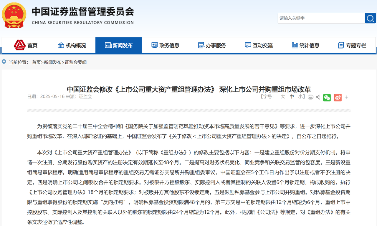 5月16日,中国证监会正式对外公布实施修订后的《上市公司重大资产重组管理办法》(以下简称《重组管理办法》),进一步深化上市公司并购重组市场改革。