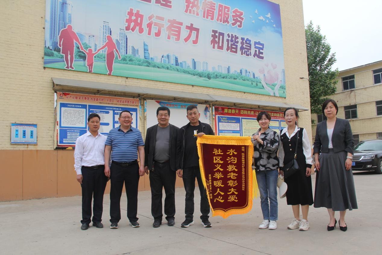 “水沟救老彰大爱 社区义举暖人心”5月13日,陕煤集团蒲白矿业公司白水马南社区马村矿退休职工高瑞海和妻子来到白水马南社区,在阵阵鞭炮声中为该社区送上了一面锦旗。