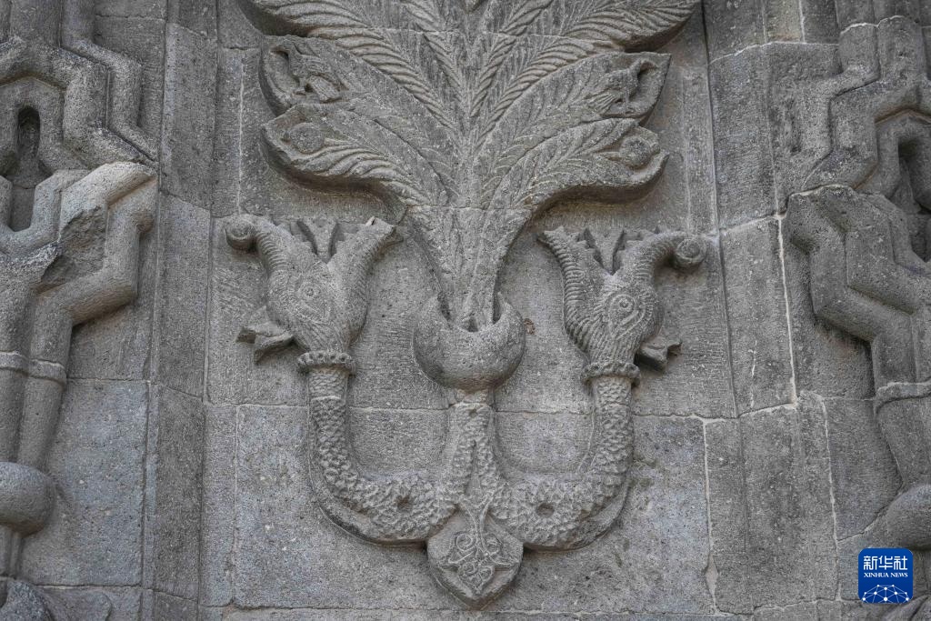 这是4月27日在土耳其埃尔祖鲁姆一座建筑上拍摄的“双龙头”图案。新华社记者 刘磊 摄
