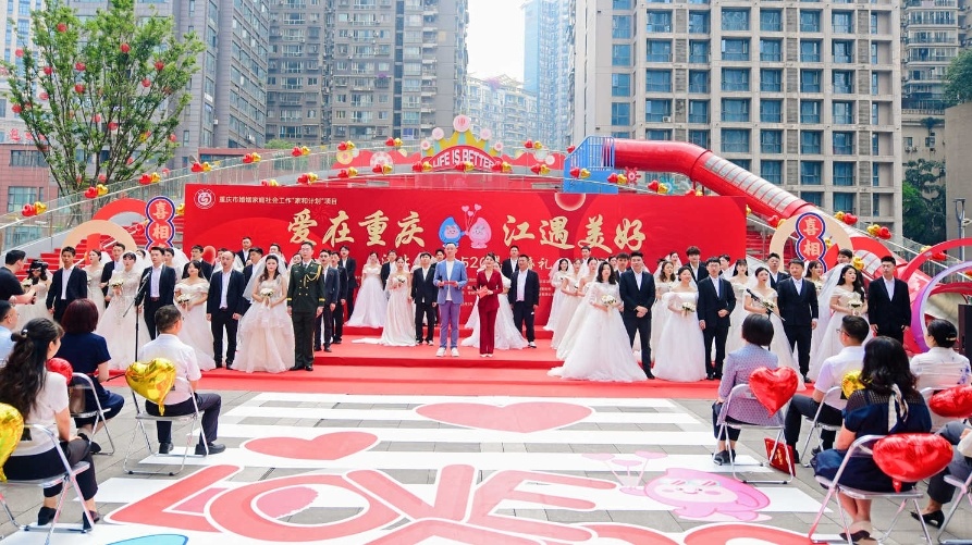 5月18日,重庆市江北区总工会联合区民政局、区融媒体中心、区妇联等部门,在江北区结婚登记户外颁证点举行“爱在重庆·江遇美好”——浪漫520集体婚礼活动。