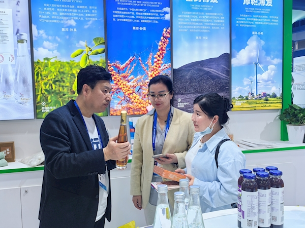 孙吴县展台前工作人员(左一)向游客介绍文创产品沙棘冰酒