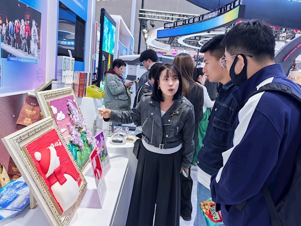 5月19日,广东省湛江市游客李先生走进第三十四届哈尔滨国际经济贸易洽谈会(简称“哈洽会”)冰雪经济展区,仔细观赏文创滑雪板、冰雪刺绣、冰雪麦秸画等各种以冰雪为主题的龙江文创产品。他说:“这里的文创产品做工精湛、内涵丰富、故事性强,能够感受到黑龙江深厚的冰雪文化底蕴。”