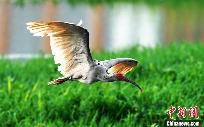 展翅飞翔的朱鹮。记者安源 摄