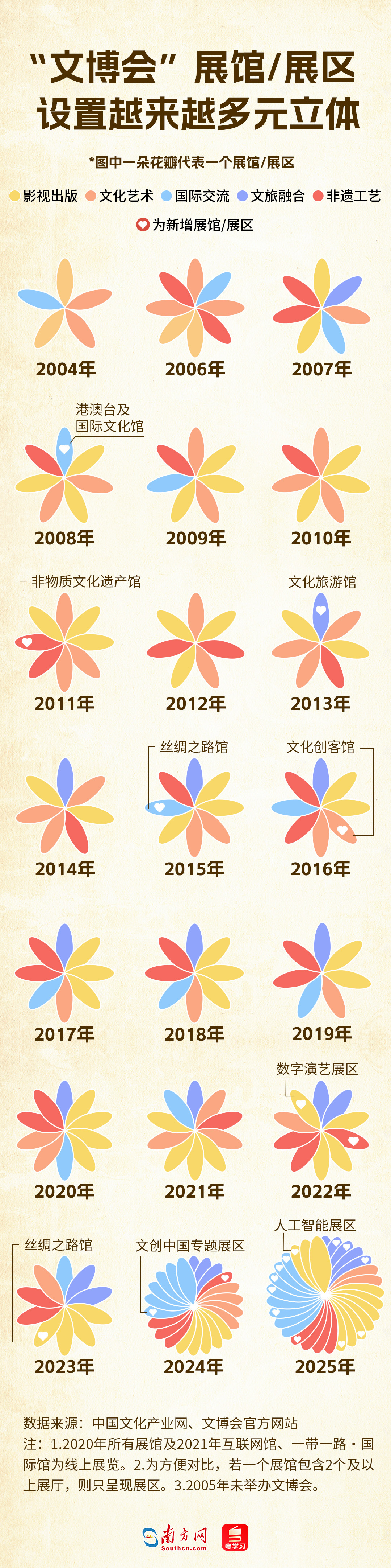 作为中国目前唯一的国家级、国际化、综合性文化产业博览交易会,文博会自2004年创办以来,从最初的4.5万平方米扩展至如今的16万平方米;参展企业数量也从700多家增至6280家,展出文化产品总数超过12万件,逐步成长为“中国文化产业第一展”的金字招牌。
