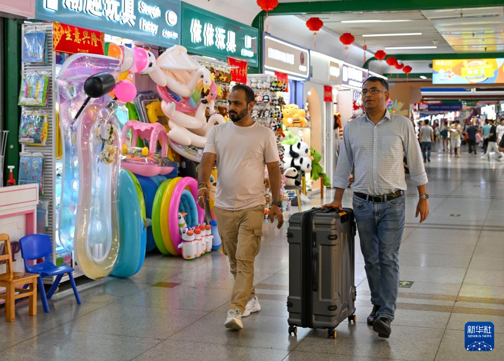 带着行李箱的外国客商在浙江义乌国际商贸城准备采购样品(5月16日摄)。新华社记者 陈朔 摄