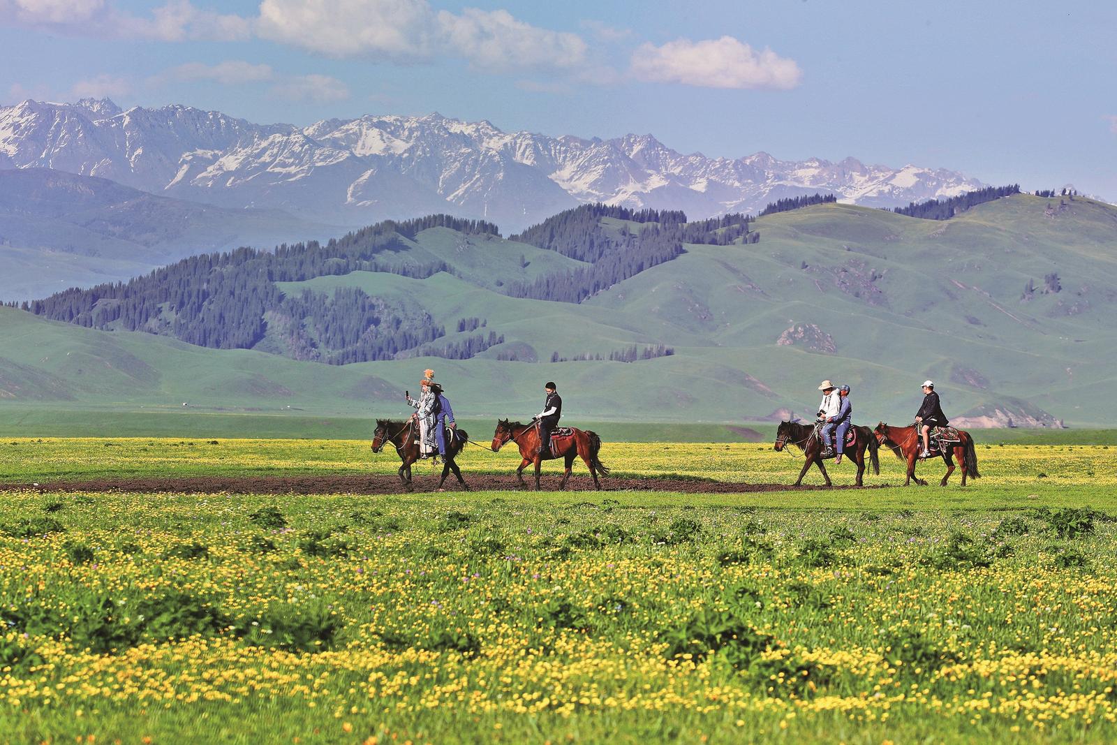 新疆伊犁那拉提草原近日迎来最佳旅游期,雪山与草原、花海相映成趣,风景美不胜收,吸引大批游客前来赏花游玩、拍照打卡。图为近日游客在那拉提草原骑马赏景。中国旅游报记者 陈晨 摄影报道