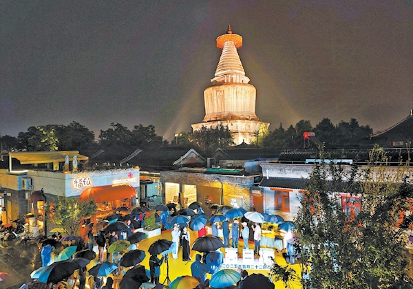 昨天19时58分,750余年历史的妙应寺白塔亮灯。这座始建于1271年的建筑瑰宝将在每周五、六、日及节假日19时至21时定期亮灯,以璀璨灯光诉说历史记忆。 北京晚报记者 方非 摄