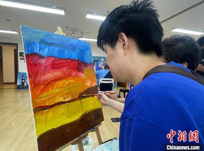 一间画室,里面摆放着一排排画架,上面的画作色彩鲜艳而浓烈。画架前坐着一个个青年,他们旁边有父母或志愿者陪着,一同一笔一笔地往画布上涂抹着颜色。