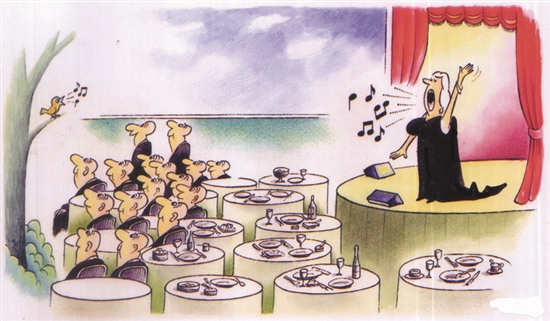 夏日野餐是十分美妙的,佳肴、音乐都不能少。可是这位歌手恶俗的歌声扫了在座的兴致,人们只能转身欣赏夜莺的啼啭。