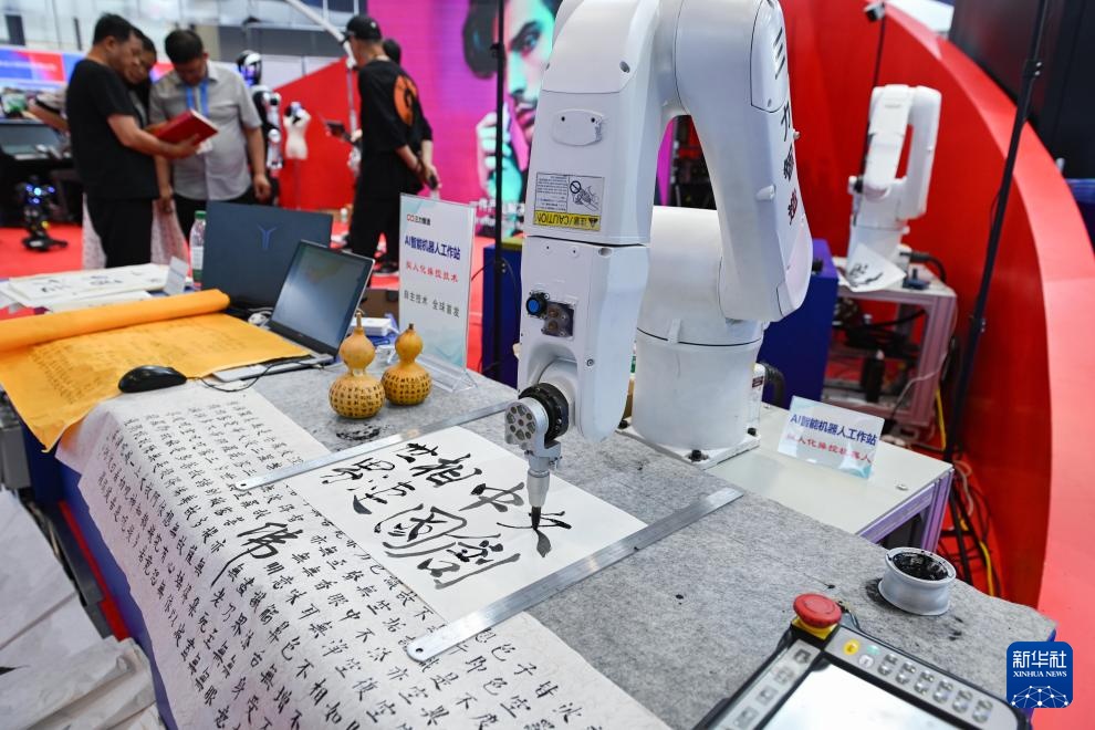 5月22日,机器人在文博会三力智造展台写书法。新华社记者 肖恩楠 摄