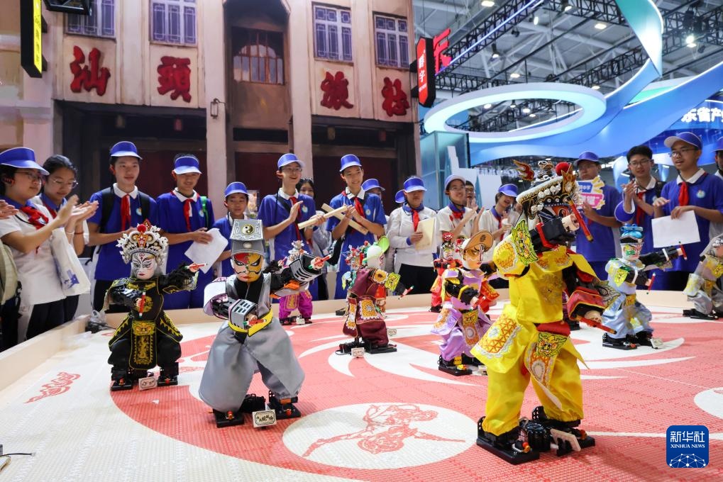 5月23日,学生在文博会上观看机器人表演英歌舞。新华社记者 梁旭 摄