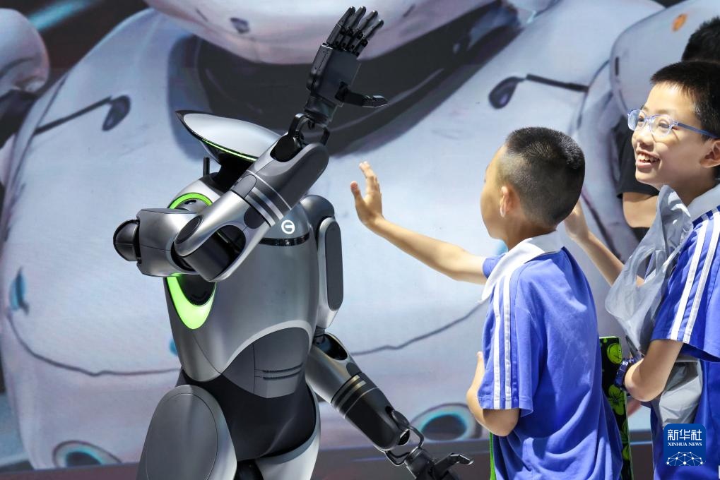 5月23日,孩子们在文博会上与机器人互动。新华社记者 梁旭 摄