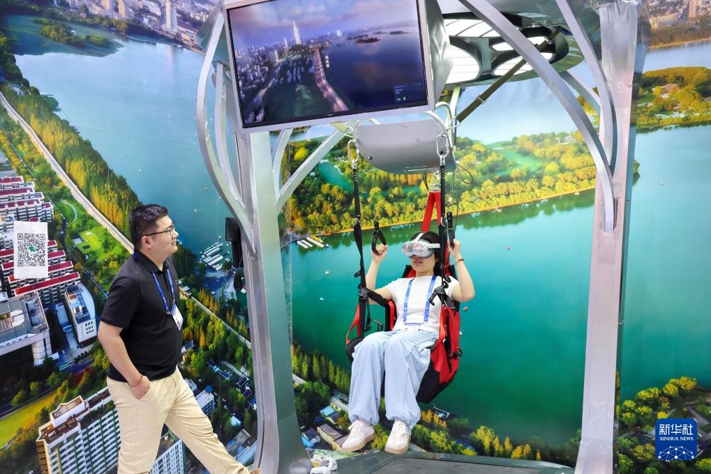 5月23日,观众在文博会上体验VR滑翔伞游南京。新华社记者 梁旭 摄