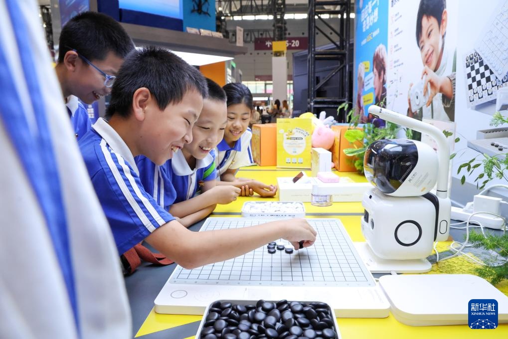 5月23日,孩子们在文博会现场体验围棋机器人。新华社记者 梁旭 摄