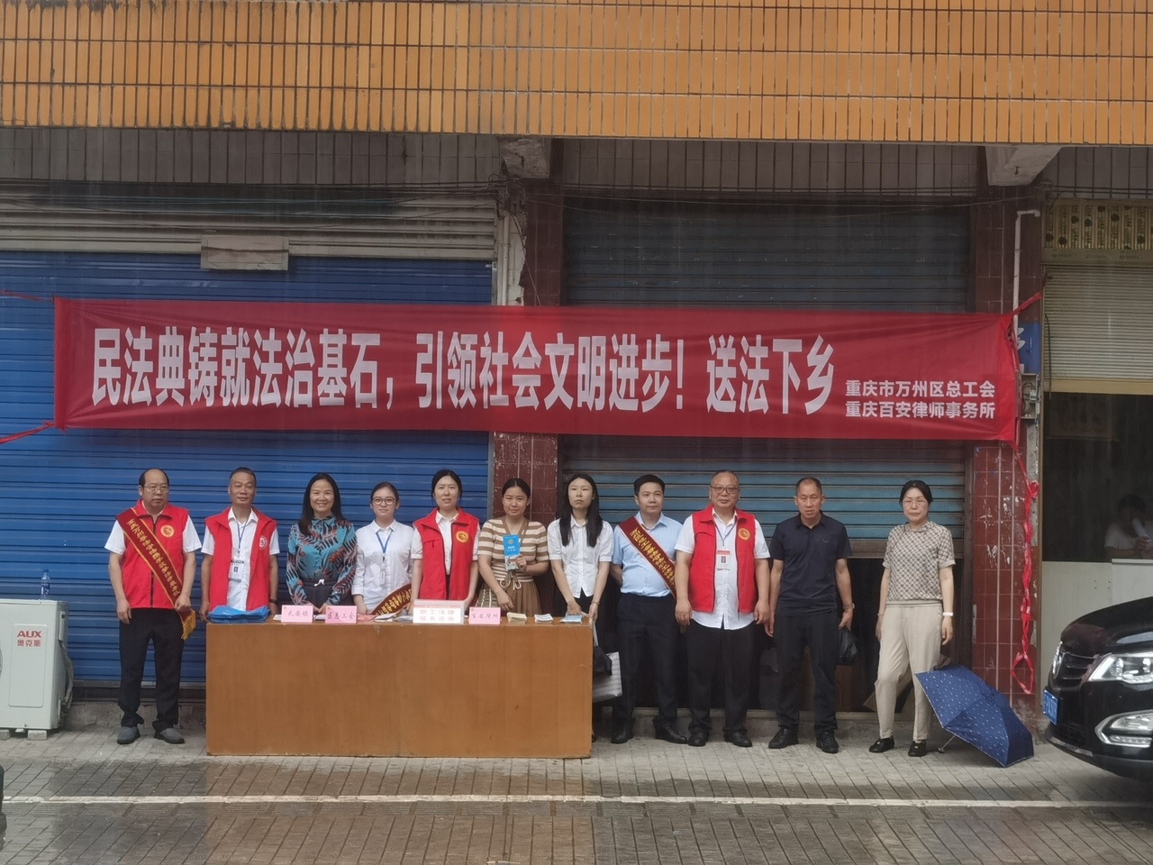 今年5月是第五个“民法典宣传月”。为提升全民法治意识、推动民法典走到广大职工身边,走进群众心里,5月22日,重庆万州区总工会联合签约服务的重庆百安律师事务所走进太安镇开展第五个“民法典宣传月”普法宣传系列活动,以“送法进乡镇街道、园区、企业、社区、广场、学校、工地”等七进活动,全方位、广覆盖的普法宣传,助力万州法治建设。