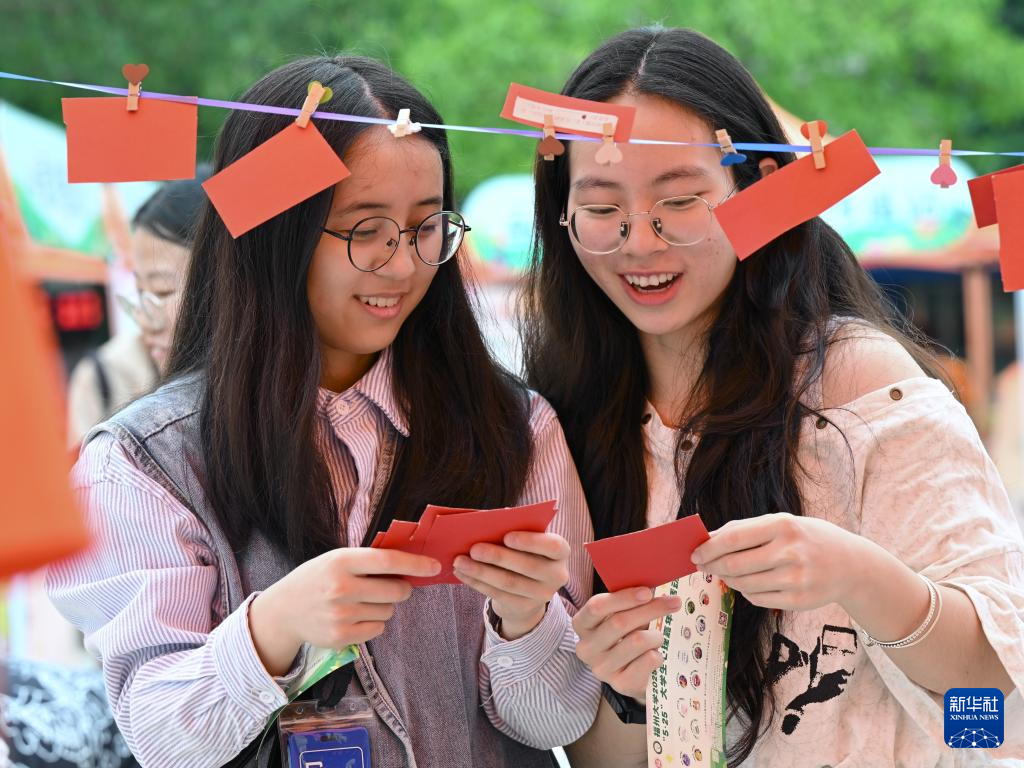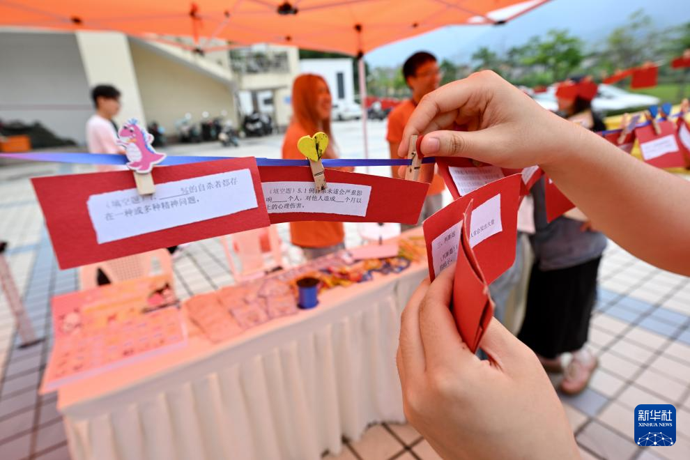 5月25日,在福州大学心理嘉年华活动上,学生在观看心理健康知识问答题卡。新华社记者 姜克红 摄