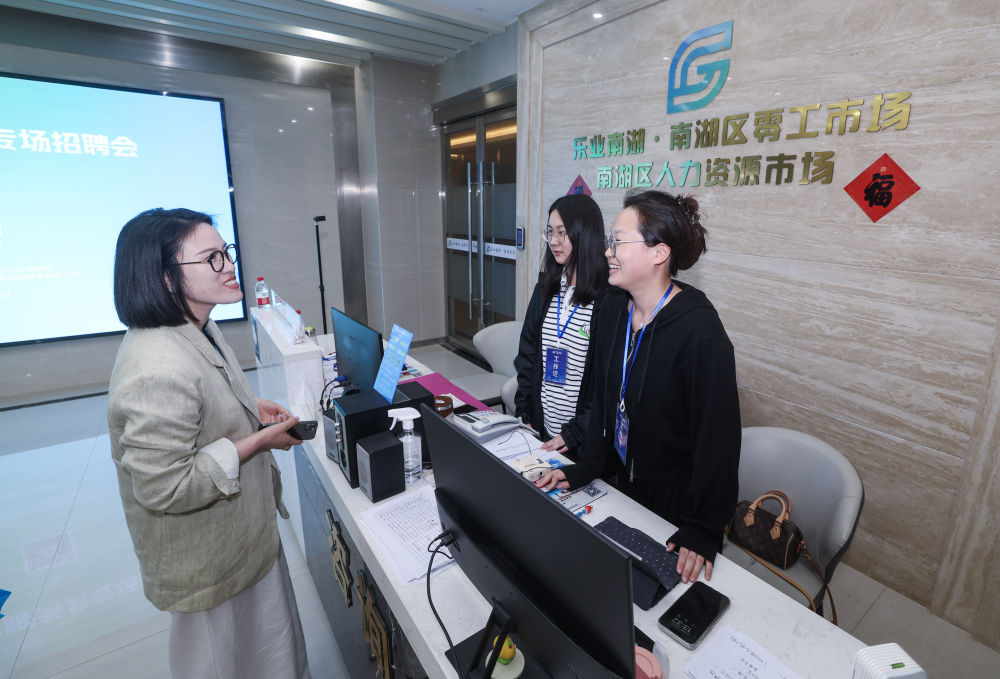 2025年5月8日,在浙江省嘉兴市南湖区人力资源市场,工作人员与招聘单位代表(左一)沟通招聘事宜。新华社记者 徐昱 摄