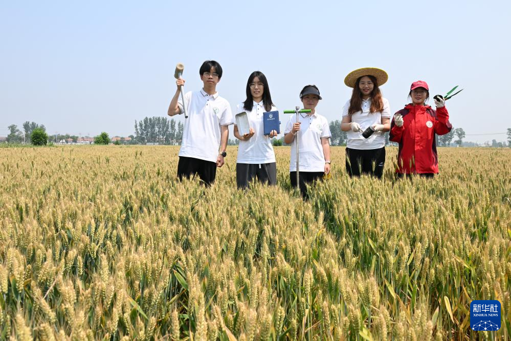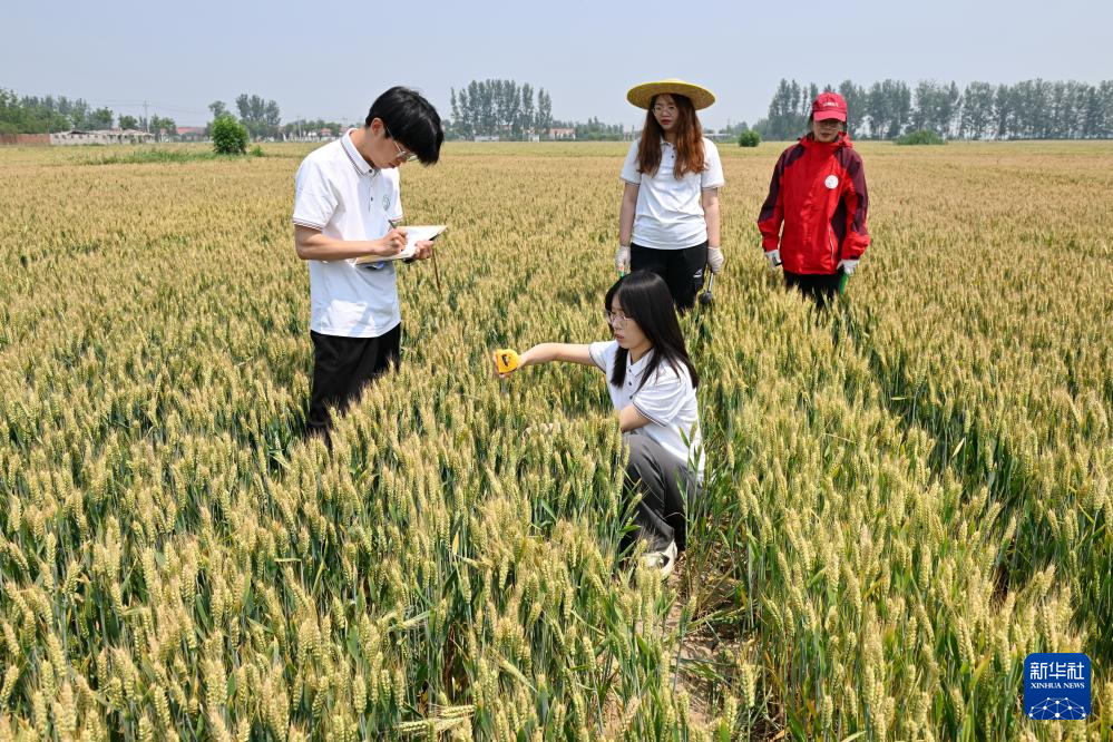 5月26日,河北省曲周县傅庄科技小院的学生在麦田里测量植株高度。新华社记者 牟宇 摄