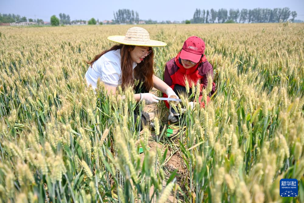5月26日,河北省曲周县刘庄科技小院的学生在试验田内收集麦粒样本。新华社记者 牟宇 摄