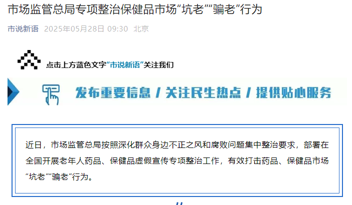 近日,市场监管总局按照深化群众身边不正之风和腐败问题集中整治要求,部署在全国开展老年人药品、保健品虚假宣传专项整治工作,有效打击药品、保健品市场“坑老”“骗老”行为。