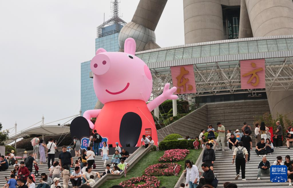 5月31日,游客在东方明珠广播电视塔下的佩奇玩偶旁游玩。新华社记者 方喆 摄