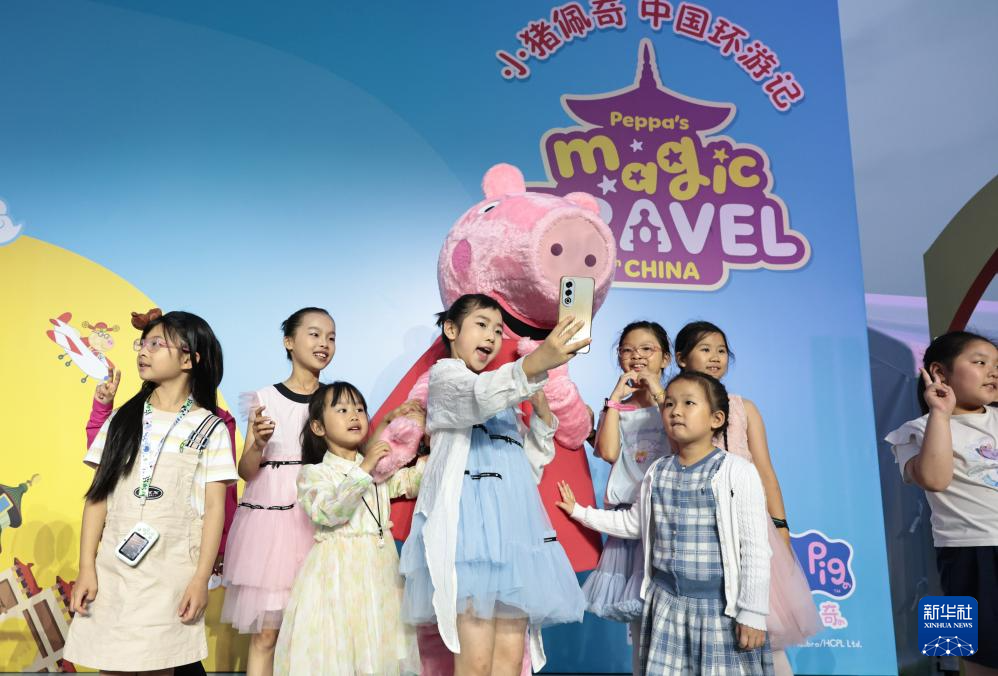 5月31日,小朋友们与工作人员装扮的佩奇玩偶互动合影。新华社记者 方喆 摄